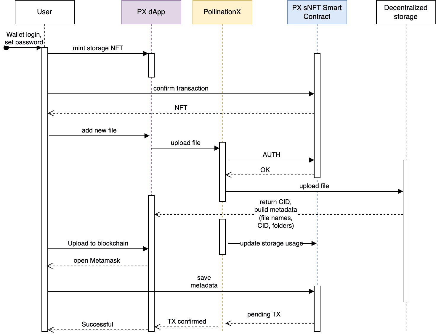The diagram illustrates the PX dApp processes between user wallets, platform, data, blockchain and decentralized storage.&#x20;